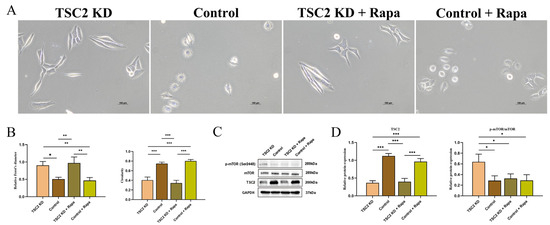 HMC3 cells in the TSC2 KD and control groups were treated with either 10 nM rapamycin (MedChemExpress, Monmouth Junction, NJ, USA) or an equivalent solvent when they reached 70–80% confluence and were then incubated for 24 h. After 24 h of treatment, the mRNA, protein lysate, and medium supernatant were extracted. In addition, rapamycin was added when the cell density reached approximately 10%, and the mixture was used for morphological analysis and immunofluorescence detection 24 h after the intervention.