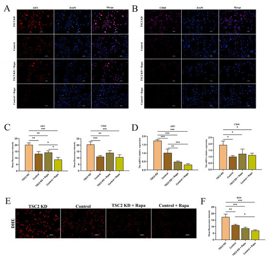 The effect of rapamycin intervention on HMC3 cells was detected. (A–C) Immunofluorescence assays revealed that AIF1 expression was downregulated in the TSC2 KD + Rapa group and the control + Rapa group and that CD68 expression was downregulated in the TSC2 KD + Rapa group. (D) RT-qPCR revealed a decrease in AIF1 mRNA levels in the TSC2 KD + Rapa group and the control + Rapa group and a decrease in CD68 mRNA levels in the TSC2 KD + Rapa group. (E,F) The level of ROS was significantly lower in the TSC2 KD + Rapa group than in the control + Rapa group. Rapa: rapamycin; N = 3; * p < 0.05, ** p < 0.01, *** p < 0.001.