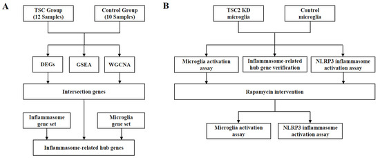 Sequencing technology and omics analysis methods enable more precise target identification. However, only a limited number of studies have sequenced cortical tubers. Therefore, in this study, we chose the EGAS00001002485 dataset of RNA-seq data from the cortical tubers of TSC patients for secondary analysis. Cellular experiments were used for further validation via bioinformatics analysis, and the activation of microglia and the NLRP3 inflammasome was investigated. In addition, the modulatory effect of rapamycin on TSC2 KD microglia was explored in this study.