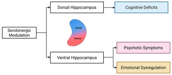 Building on these insights, we propose a model of dorsoventral serotonergic imbalance in schizophrenia. In this framework, serotonin-driven hyperactivation of the ventral hippocampus contributes to psychotic symptoms [60,61]; persistent dysregulation in this region may underlie emotional disturbances [62,63,64], and impaired serotonergic signaling in the dorsal hippocampus is implicated in cognitive deficits [65,66] (Figure 1). By targeting region-specific serotonin receptors, this model offers a novel perspective on the symptom heterogeneity of schizophrenia and identifies potential avenues for precise, circuit-based therapeutic interventions.