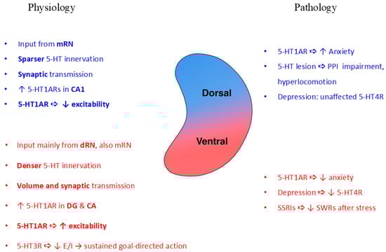 Roles of the serotonergic system in regulating the dorsal and ventral hippocampus in physiological and pathophysiological states. Arrows indicate the direction of change. ↑ represents an increase or enhancement, and ↓ represents a decrease or reduction in the respective parameter.