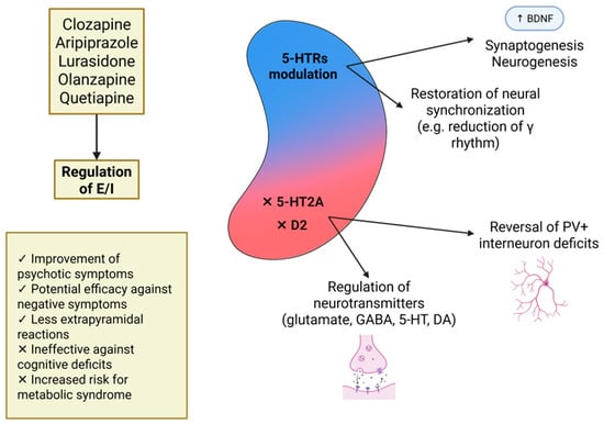 Briefly, in the CA1 hippocampal region, 5-HT2R, 5-HT4R, 5-HT6R, and 5-HT7R increase the magnitude of LTP, while 5-HT1AR and 5-HT3R have the opposite effect. In the CA3 region, 5-HT3R reduces LTP, while 5-HT4R prevents long-term plasticity. In the DG, 5-HT1AR, 5-HT4R, 5-HT6R, and 5-HT7R increase LTP. Therefore, serotonin can regulate long-term synaptic plasticity in the hippocampus in a complex manner, depending on the spatial and temporal pattern of receptor activation. This regulation is particularly important, as dysconnectivity, whether anatomical (e.g., aberrant wiring during brain development) [293] or functional (e.g., impairments in synaptic plasticity) [294], is thought to contribute to the pathophysiology of schizophrenia [295]. More specifically, according to the functional disconnection hypothesis [296], the core pathological mechanism in schizophrenia involves aberrant NMDA receptor-mediated synaptic plasticity, resulting from its dysregulated modulation by neuromodulatory transmitters such as 5-HT, ACh, and DA. Dysfunctional synaptic plasticity, whether enhanced or diminished, is a characteristic feature of the hippocampus in relation to schizophrenia-like deficits [297]. For instance, studies using the NMDA receptor antagonist MK-801 to model schizophrenia have demonstrated impaired PP-DG LTP [298,299], impaired SC-CA1 LTP [300], and enhanced CA1–subiculum LTP [301]. Accordingly, the modulatory effects of serotonergic receptors, such as 5-HT2AR and 5-HT7R, on glutamate levels and consequently on NMDA receptor activation could promote a state of metaplasticity with potential beneficial effects on neuropsychiatric symptoms [302]. Furthermore, genetic rodent models of the disorder show either enhanced [303] or reduced [304] LTP at CA3–CA1 synapses.