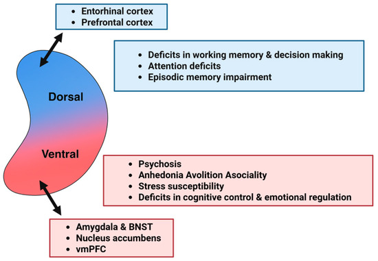Specifically, emerging evidence from both preclinical and clinical studies indicates that the dorsal and ventral hippocampus, corresponding to the posterior and anterior hippocampus in humans, respectively, are differentially involved in the pathophysiology of schizophrenia [34,35,36,37,38]. This pattern is consistent with broader dorsoventral segregation in hippocampal function, connectivity, intrinsic physiology, and susceptibility to pathology [26,27,28,29,30,31,39,40,41,42,43,44,45]. The dorsal hippocampus is primarily involved in cognitive functions such as episodic memory, spatial navigation, attention, and decision-making [46,47,48,49], while the ventral hippocampus is more strongly associated with emotional regulation, motivation, reward-related learning, and stress responsiveness [50,51,52,53]. Furthermore, dorsoventral specialization extends to neuromodulatory influences, including cholinergic, adrenergic, and dopaminergic signaling [40], and growing evidence suggests that serotonergic modulation also differs along the longitudinal axis of the hippocampus, both in physiological function and in psychiatric conditions such as schizophrenia [4,54,55,56]. Additionally, hippocampal serotonergic dysfunction has been increasingly implicated in schizophrenia pathophysiology [57,58,59]. However, how serotonergic modulation along the dorsoventral hippocampal axis contributes to the disorder remains largely unclear.