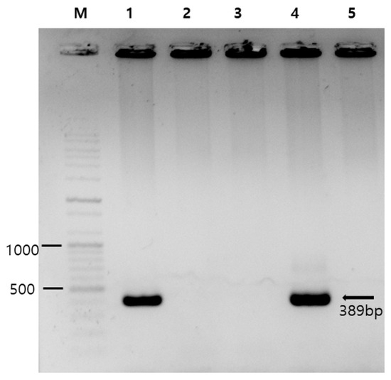 Water samples (10 mL each) were collected from each farm and concentrated via centrifugation (10,000 rpm, 10 min). The resulting pellets were used for DNA extraction. Soil samples (5 g) were washed and vortexed in distilled water for 5 min, and the pellets were used for DNA extraction using a QIAamp Fast DNA Stool Mini Kit (Qiagen, Hilden, Germany) according to the instructions of the manufacturer. DNA quantity and quality were measured with an Infinite 200 PRO NanoQuant plate reader (Tecan, Männedorf, Switzerland). Additionally, PCR amplification was conducted using AccuPower HotStart PCR Premix (Bioneer, Daejeon, Republic of Korea) and was followed by nested PCR targeting the E. bieneusi ITS region. The first-round PCR used ITSF1 (5′-GGTCATAGGGATGAAGAG-3′) and ITSR1 (5′-TTCGAGTTCTTTCGCGCTC-3′) as forward and reverse primers, respectively. The second-round PCR employed ITSF2 (5′-GCTCTGAATATCTATGGCT-3′) and ITSR2 (5′-ATCGCCGACGGATCCAAGTG-3′) as forward and reverse primers, respectively [20,47]. The expected amplicon size was 389 bp. PCR amplification was performed with a Mastercycler Pro (Eppendorf, Hamburg, Germany) under the following conditions: initial denaturation at 95 °C for 5 min; 35 cycles of denaturation at 95 °C for 30 s, annealing at 55 °C for 30 s, extension at 72 °C for 30 s, and a final extension at 75 °C for 5 min. All PCR products were visualized via 1% agarose gel electrophoresis with ethidium bromide staining (Figure 1), and positive samples were subsequently subjected to base-sequence analysis by Macrogen (Daejeon, Republic of Korea). To ensure the validity of the PCR and electrophoresis results, an E. bieneusi-positive DNA sample obtained from our previous study [10] was used as a positive control, and sterile distilled water was included as a negative control for visualization.