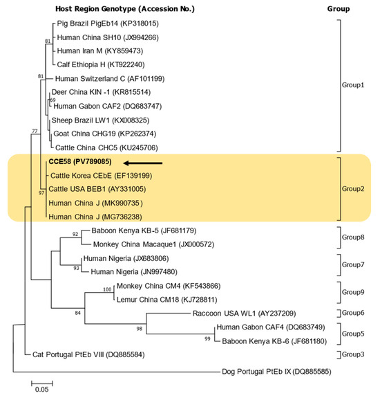 Bidirectional sequences were obtained by sequencing analysis, and a consensus sequence was obtained using BioEdit version 7.7.1; this sequence was submitted to GenBank under the accession number PV789085. The 326 bp fragment contains small subunit ribosomal RNA and an ITS region. The sequence obtained from the polymerase chain reaction (PCR)-positive sample (CCE58) was classified within Group 2 of E. bieneusi. This genotype matched BEB1, which has previously been identified in cattle from both the USA and Korea (Figure 2).