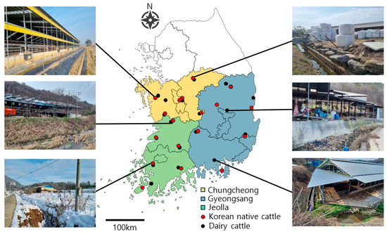 Administrative districts were grouped into three regions: Chungcheong, Gyeongsang, and Jeolla Provinces (Figure 3). From each province, six or more dairy and beef (Korean native cattle) farms were selected (Figure 3), and soil and water samples were collected from farms of each type. Sampling was conducted four times per farm—once in each season (spring, summer, fall, and winter)—to assess seasonal variation.