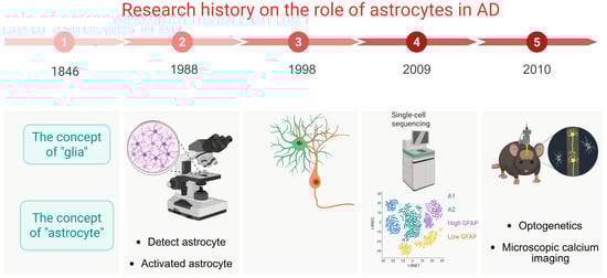 History of the research on astrocytes. In 1846, the concept of glial cells was first proposed. In 1988, the morphology of astrocytes was successfully detected. In 1998, the interaction between astrocytes and neurons was explored. In 2009, single-cell sequencing technology was used to study the different expression clusters of astrocytes in AD. And, in 2010, researchers began to gradually understand mechanisms of astrocytes in the pathogenesis of AD using new technologies, such as optogenetics and calcium imaging.