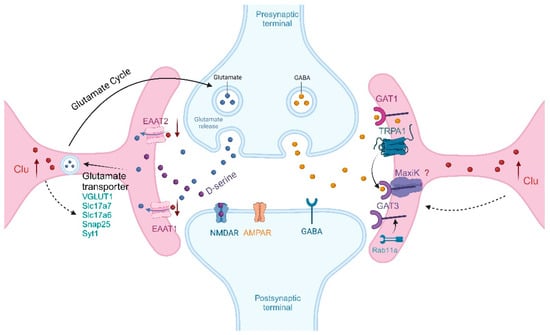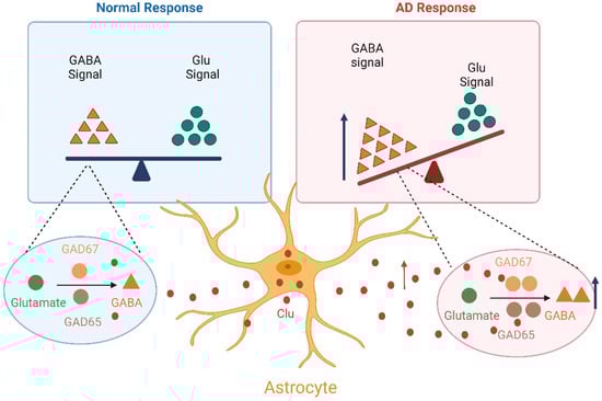 Clu is involved in the imbalance of excitability/inhibition. Aberrant activation of astroglial cells in AD leads to increased expression of Clu, resulting in a significant increase in GAD65 and GAD67, the key enzymes in GABA synthesis. Finally, the excitatory/inhibitory balance of neurons is disrupted.
