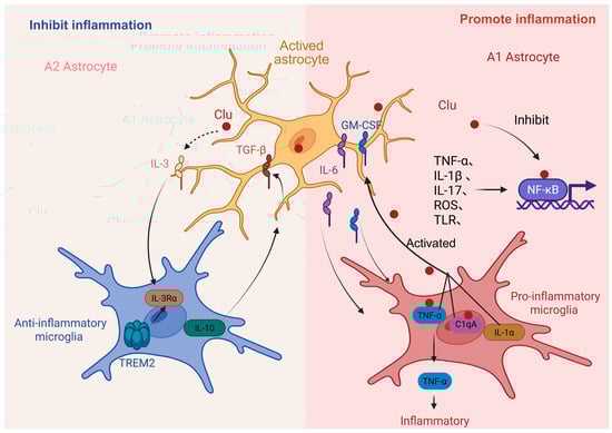 Clu in astrocytes is involved in inflammation in AD. Clu promotes inflammation through the interaction of A1 astrocytes with microglia. In addition, Clu inhibits inflammation through the interaction of A2 astrocytes with microglia.