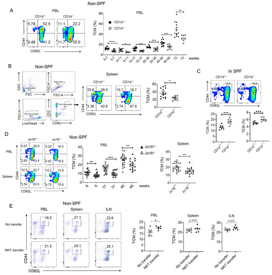 Figure 1. Comparison of the TCM population in littermates of CD1d+/− (Jα18+/−) and CD1d−/− (Jα18−/−) mice under steady-state conditions. (A) Representative flow cytometry plots showing the analysis of central memory (CD44+ CD62L+) CD8+ T cells (TCM) in the peripheral blood (PBL) (left panel). Statistical data representing the percentages of TCM in littermates of CD1d+/− and CD1d−/− mice at various ages (right panel). (B) Representative flow cytometry plots showing the analysis of TCM in the spleens of 72-week-old CD1d+/− and CD1d−/− mice, along with their gating strategy (left panel). Statistical data depicting the percentages of TCM in littermates of CD1d+/− and CD1d−/− mice (right panel). (C) Representative flow cytometry plots showing the analysis of TCM and TEM in the PBL of SPF mice. Statistical data representing the percentages of TCM and TEM in littermates of CD1d+/− and CD1d−/− mice at 8–10 weeks (right panel). (D) Representative flow cytometry plots showing the analysis of TCM in the PBL and spleens (46-week-old mice) (left panel). Statistical data representing the percentages of TCM in littermates of Jα18+/− and Jα18−/− mice at various ages (right panel). (E) A total of 4 × 105 NKT cells isolated from CD1d+/− mice were transferred into CD1d−/− mice. After 4 weeks of transfer, the frequencies of CD8+ TCM in the PBL, spleens and inguinal lymph nodes (ILNs) were analyzed. Non-cell-transfer group (n = 7); NKT cell transfer group (n = 6). The number of CD1d+/− and CD1d−/− mice in conventional condition (non-SPF): 5–7 weeks, n = 11/13; 9–11 weeks, n = 10/5; 15–17 weeks, n = 18/10; 20–30 weeks, n = 11/9; 40–50 weeks, n = 15/9; 72 weeks, n = 13/7. The number of CD1d+/− and CD1d−/− mice in SPF: 8–10 weeks, n = 8/7. The number of Jα18+/− and Jα18−/− mice: 6 weeks, n = 19/15; 31 weeks, n = 22/15; 46 weeks, n = 23/15. Means with SEM are shown. Statistics: Statistical significance was determined using one-way ANOVA with Tukey tests for multiple-group comparisons (A,C); non-paired two-tailed Student’s test (B,D,E). * p < 0.05, ** p < 0.01, *** p < 0.001, **** p < 0.0001.