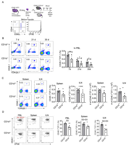 Figure 2. CD1d−restricted NKT cells promote the survival and homeostatic proliferation of memory OT-1 cells. (AD) A total of 6 × 105 CFSE-labeled memory CD45.1+ OT-1 cells were intravenously injected into CD45.2+ CD1d+/− and CD45.2+ CD1d−/− mice, respectively. Four mice per group. The schematic diagram of the experimental workflow and flow cytometry plots illustrate the memory phenotypes of OT-1 cells following CFSE labeling prior to transfer. The transferred OT-1 cells were detected in PBL at the indicated time points. The transferred OT-1 cells were detected in the spleens and inguinal lymph nodes (ILNs) on day 35. On day 35, the frequencies of OT-1 cells in CFSE division zones (D2, D2 + D3) were examined in PBL, spleens and ILNs. Each dot represents a mouse. CD1d+/− (n = 4); CD1d−/− (n = 4). Representative results are from three independent experiments with consistent results. Means with SEM are shown. Statistics: non-paired two-tailed Student’s test: * p < 0.05, ** p < 0.01.