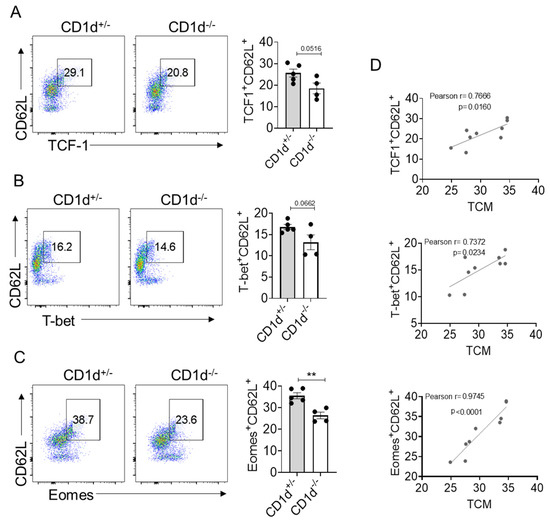 Figure 3. Examination of transcription factors related to TCM. The proportions of TCF1+ CD62L+ (A), T-bet+CD62L+ (B) and Eomes+ CD62L+ (C) within CD8+ T cells were examined via FACS analysis in the spleens of 10–12-week-old CD1d+/− and CD1d−/− mice. The frequencies of TCF1+ CD62L+, T-bet+ CD62L+, and Eomes+ CD62L+ CD8+T cells were correlated with CD44+ CD62L+ CD8+ T cells (TCM) (D). Each dot represents a mouse. CD1d+/− (n = 5); CD1d−/− (n = 4). Representative results are from three independent experiments with consistent results. Data are presented as means ± SEM. Statistical significance was measured by unpaired two-tailed Student’s t test (AC) and Pearson’s correlation coefficient. ** p < 0.01.