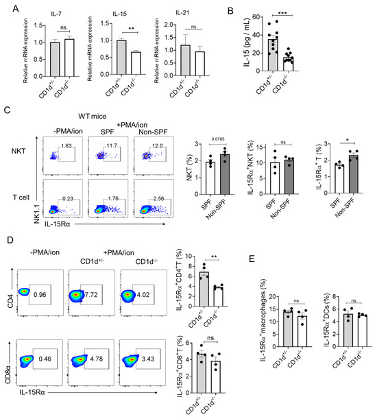 Figure 4. Examination of cytokines related to TCM formation. (A) qPCR analysis of the mRNA level of IL-7, IL-15, and IL-21 in freshly isolated splenocytes from 10–12-week old CD1d−/− and CD1d+/− mice. The data were collected from CD1d+/− (n = 9) and CD1d−/− (n = 8) mice. (B) The protein levels of IL-15 were detected in the serum of CD1d+/− and CD1d−/− mice, with 10 mice in each group. (C) The expression levels of IL-15Rα on the surface of NKT or T cells in the spleens of wild-type mice bred in SPF or “dirty” conditions were examined. Four mice per group. The data are representative of three independent experiments. The expression levels of IL-15Rα on the surface of CD4+ T cells and CD8+ T cells (D), Macrophages and DCs (E) in the spleens of CD1d+/− and CD1d−/− mice were compared. Four mice per group. The data are representative of three independent experiments. Means with SEM are shown. Statistics: non-paired two-tailed Student’s test: * p < 0.05, ** p < 0.01, *** p < 0.001, ns p > 0.05.