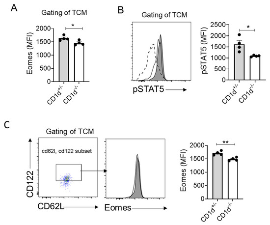 Figure 5. CD1d-restricted NKT cells facilitate the homeostatic formation of TCM through the IL-15-pSTAT5-Eomes axis. (A) Expression levels of Eomes in TCM of CD8+ T cells were expressed via mean fluorescence intensity (MFI). (B) Phospho-flow cytometry of STAT5 in TCM of CD8+ T cells from CD1d+/− and CD1d−/− splenocytes’ response to IL-15 stimulation. The histogram illustrates the MFI of STAT5 phosphorylation in TCM. The dashed lines represent cells that are not stimulated by IL-15. (C) The expression of Eomes in CD62L+ CD122+ gated on TCM of CD8+ T cells from CD1d+/− and CD1d−/− mice was displayed and expression levels of Eomes were compared through MFI. Each dot represents a mouse. Four mice per group. The data are representative of three independent experiments. Means with SEM are shown. Statistics: non-paired two-tailed Student’s test: * p < 0.05, ** p < 0.01.