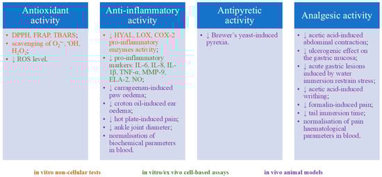 - Marinov, L.; Momekov, G.; Voynikov, Y.; Zheleva-Dimitrova, D.; Gevrenova, R.; Balabanova, V.; Mangarov, I.; Nikolova, I. Anti-inflammatory and analgesic effects of Filipendula ulmaria extract. Pharmacia 2025, 72, 1–11. [Google Scholar] [CrossRef]