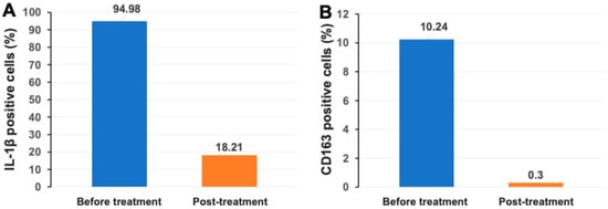 Decrease in monocyte/macrophage-associated inflammatory markers in PBMCs after the treatment with Stem Cell Educator therapy. (A) Marked decline in the percentage of IL-1β+ cells. (B) Reduced percentage of CD163+ cells.