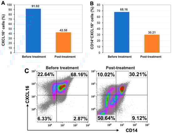 The C-X-C motif ligand 16 (CXCL16) is a chemokine and is expressed by a variety of immune cells, such as monocytes/macrophages, dendritic cells, and B cells. Recent studies suggest the contribution of CXCL16 in the pathogenesis of autoimmune diseases such as Crohn’s disease, multiple sclerosis, rheumatoid arthritis, and lupus [,,]. Flow cytometry showed that the patient’s PBMCs displayed high percentages of CXCL16+ cells, 91.92% at baseline. This was significantly reduced to 42.58% two months after treatment with Stem Cell Educator therapy (Figure 2A). CXCL16 is normally enriched in the monocytes/macrophages. Using the monocyte-specific marker CD14, further flow cytometry analysis demonstrated that the percentage of CD14+CXCL16+ monocytes was down-regulated from 68.16% at baseline to 30.21% at 2-month follow-up (Figure 2B,C). Additionally, the percentage of the costimulating molecule CD86 (B7-2) was reduced from 3.83% at baseline to 1.66% at 2-month follow-up. There were no marked changes in the costimulating molecules CD80 (B7-1, 0.00% vs. 0.01%), CD282 (TLR-2, 1.38% vs. 0.01%), and CD284 (TLR4, 0.01% vs. 0.01%) pre- and post-treatment. The data implied a decline in the infiltration and activation of monocytes/macrophages.