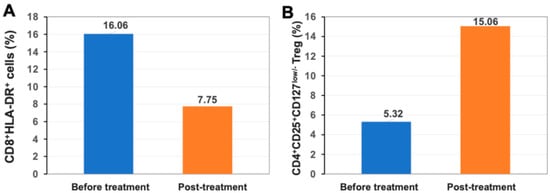 Using HLA-DR as a marker for activated T cells, flow cytometry showed that the percentage of activated CD8+HLA-DR+ T cells was reduced from 16.06% at the baseline to 7.75% at 2-month follow-up (Figure 3A). There were no changes in the percentage of activated CD4+HLA-DR+ T cells after treatment (11.49% at baseline vs. 12.91% at 2-month follow-up). Additionally, flow cytometry demonstrated that the percentage of CD4+CD25+CD127low/− Tregs was increased from 5.32% at the baseline to 15.06% at 2-month follow-up (Figure 3B), which might contribute to the down-regulation of activated CD8+ T cells.