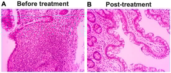 Additional clinical and animal studies have indicated various types of immune cells involved in the pathogenesis of Crohn’s disease, such as T cells [,,], B cells [,,], and NKT cells [,,]. Flow cytometry showed a high level of activated CD8+ T cells in this patient before treatment, which was markedly reduced after Stem Cell Educator therapy. Notably, Stem Cell Educator therapy displayed a range of immune modulations via multiple molecular and cellular mechanisms in different compartments of immune cells, such as inducing immune tolerance through the expression of autoimmune regulators (AIREs) in CB-SCs []; down-regulating activated T cells and B cells through cell–cell interactions mediated by PD-L1 (CD274) and HVEM (CD270), which are expressed on CB-SCs and whose ligands, PD-1 and BTLA, are expressed on immune cells (T cells, B cells, monocytes, DC, and granulocytes) []; suppressing the proliferation of activated B cells; and reducing antibody production through a galectin-9-mediated cell–cell contact mechanism []. Therefore, Stem Cell Educator therapy may hold great promise in treating patients with Crohn’s disease and ulcerative colitis and improving their quality of life.