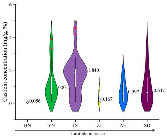 Internal casticin content of VF collected in Hainan, Yunnan, Jiangxi, Zhejiang, Anhui, and Shandong Provinces (in the violin plot, the width of the violin represents the density of the data, thin lines indicate 95% confidence intervals, white bar-shaped regions indicate interquartile ranges, red dots indicate outliers, and white dots indicate means).
