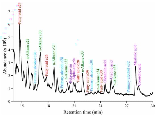 GC-MS chromatogram of VF wax (red represents fatty acids, green represents n-alkanes, blue represents primary alcohols, and purple represents triterpenoids).
