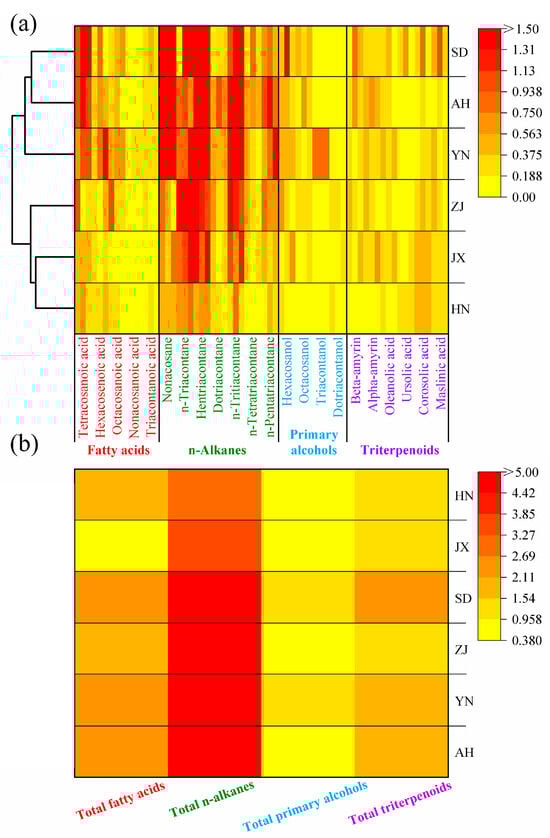 To further visualize the content of wax categories, a heat-map was created for four primary categories (Figure 3b). The darkest color block corresponded to n-alkanes, indicating that n-alkanes had the highest content among all wax categories. In AH, which had the highest total wax content, n-alkanes measured 16.4 μg/cm2, accounting for 76.67% of the total wax. In contrast, the content of n-alkanes from HN, YN, JX, ZJ, and SD were 2.75, 10.10, 5.00, 6.42, and 10.50 μg/cm2, respectively, accounting for 42.8%, 61.8%, 54.9%, 61.8%, and 63.0% of the total wax content from each area (Table 3).