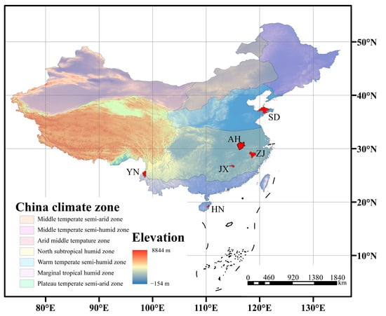 Soil and climate indicators of the different sampling sites as shown in Table 2. The latitude and altitude data were sourced from Google Earth (https://earth.google.com, accessed on 5 July 2025). The soil type and soil pH data were obtained from the Institute of Soil Science, Chinese Academy of Sciences (http://issas.cas.cn, accessed on 5 July 2025) and World Soil Information (ISRIC)—SoilGrids (https://soilgrids.org, accessed on 5 July 2025). The climate data were derived from China Meteorological Data Network (http://data.cma.cn, accessed on 6 July 2025) and National Climate Center (http://cmdp.ncc-cma.net, accessed on 6 July 2025).