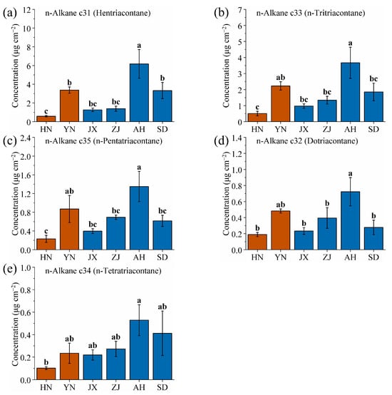 Comparison of (a) hentriacontane, (b) n-tritriacontane, (c) n-pentatriacontane, (d) dotriacontane, and (e) n-tetratriacontane wax contents of VF from six production areas (HN, YN, JX, ZJ, AH and SD). Different lowercase letters indicate significant differences, p < 0.05, Duncan’s HSD test.