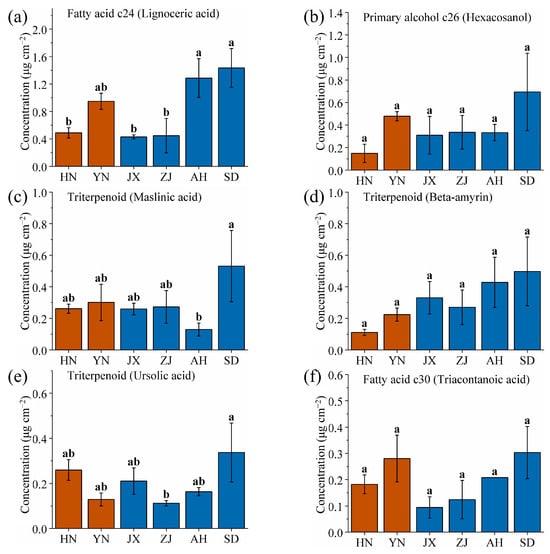 Comparison of (a) lignoceric acid, (b) hexacosanol, (c) maslinic acid, (d) beta-amyrin, (e) ursolic acid, and (f) triacontanoic acid wax contents of VF from six production areas (HN, YN, JX, ZJ, AH, and SD). Different lowercase letters indicate significant differences, p < 0.05, Duncan’s HSD test.