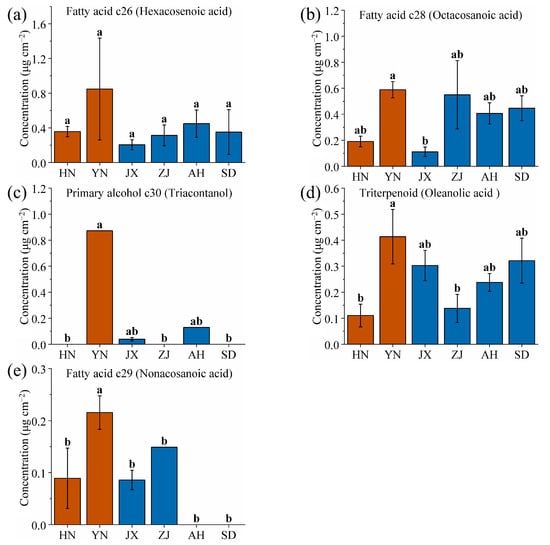 Comparison of (a) hexacosenoic acid, (b) octacosanoic acid, (c) triacontanol, (d) oleanolic acid, and (e) nonacosanoic acid wax contents of VF from six production areas (HN, YN, JX, ZJ, AH and SD). Different lowercase letters indicate significant differences, p < 0.05, Duncan’s HSD test.