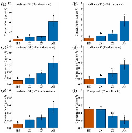 Comparison of (a) hentriacontane, (b) n-tritriacontane, (c) n-pentatriacontane, (d) dotriacontane, (e) n-tetratriacontane, and (f) corosolic acid wax contents of VF from four production areas (HN, JX, ZJ and AH). Different lowercase letters indicate significant differences, p < 0.05, Duncan’s HSD test.