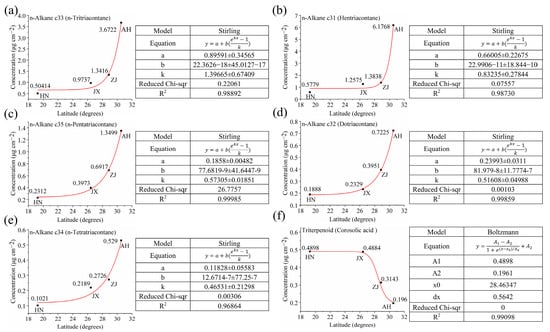 Fitting curves of (a) hentriacontane, (b) n-tritriacontane, (c) n-pentatriacontane, (d) dotriacontane, (e) n-tetratriacontane, and (f) corosolic acid waxes to latitude.