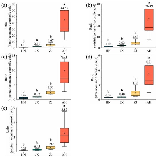 Wax ratio of (a) hentriacontane/corosolic acid, (b) n-tritriacontane/corosolic acid, (c) n-pentatriacontane/corosolic acid, (d) dotriacontane/corosolic acid, and (e) n-tetratriacontane/corosolic acid. Different lowercase letters indicate significant differences, p < 0.05, Duncan’s HSD test.