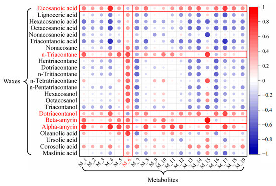 Additionally, we combine the vertical data with five wax components—hentriacontane, n-tritriacontane, n-pentatriacontane, dotriacontane, and n-tetratriacontane—that show a monotonic correlation with latitude, and these components are highlighted in red (Figure 12). The results reveal that metabolite M6 (myricetin) exhibits the strongest positive correlation with these five wax components, which also show distinct latitude-dependent distribution patterns.