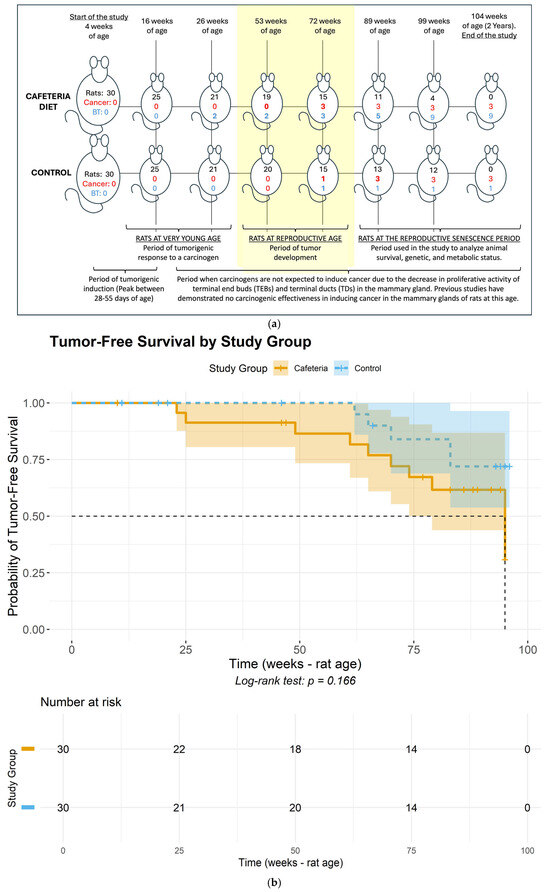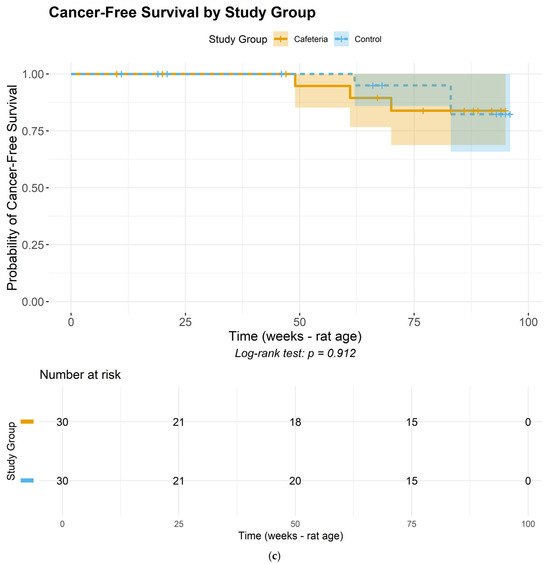 (a). Cumulative histopathological findings in the mammary glands throughout the rats’ lifespan. Rats = number of rats alive at each time point; Cancer = cumulative incidence of malignant breast tumors among rats euthanized at each time point; BT = cumulative incidence of benign breast tumors among rats euthanized at each time point. (b) Tumor-free (either benign or carcinoma) survival curves for the control and cafeteria groups. (c) Cancer-free (carcinoma) survival curves for the control and cafeteria groups. (a–c) portray the timeline of events regarding tumor development throughout the approximately two-year study duration. Specifically, (a) depicts the timeline of tumor development during the study across the cafeteria and Control groups, while (b,c) depict the tumor-free and cancer-free survival probabilities for the study groups.