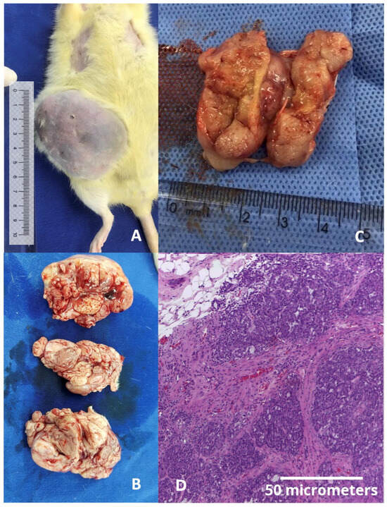 (A) Gross image of a fibroadenoma colonized by a ductal carcinoma in a middle-aged rat weighing 577.30 g, taken just before tissue harvesting. This was the largest tumor observed in the study (weighing 53 g) and the only case in which humane endpoint criteria were applied, as the tumor approached 10% of the animal’s body weight seven weeks after initial detection. Notably, this size was reached under rigorous daily monitoring, with no signs of weight loss, ulceration (as shown), pain, distress, impaired mobility, or behavioral changes, in accordance with institutional ethical guidelines. (B) Macroscopic view of the same fibroadenoma shown in panel (A). (C) Macroscopic view of a ductal carcinoma in a middle-aged rat. (D) Microscopic view of a ductal carcinoma stained with hematoxylin and eosin (H&E), 400× magnification.