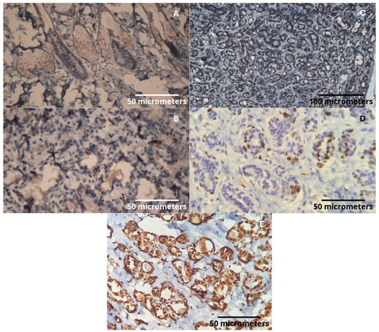 The immunohistochemical technique was performed based on histological findings in the Special Pathology Laboratory of the Women’s Hospital Professor, Dr. J. A. Pinotti—UNICAMP, as follows: new sections of paraffin-embedded tissue were placed on histological slides using an organosilane adhesive. After deparaffinization, the sections were hydrated in three water baths, followed by washing under running water for three minutes. To inhibit endogenous peroxidase activity, the slides underwent three three-minute baths each in a 3% hydrogen peroxide solution, followed by another water wash for three minutes. Antigen retrieval was performed by immersing the sections in a specific buffer according to the manufacturer’s guidelines for each kit, at approximately 98 °C for 30 min, using a Pascal pan. After cooling, the slides were washed in running and distilled water and then placed in a phosphate buffer solution (PBS) for five minutes. The slides were incubated with primary antibodies for 30 min in a greenhouse at 37 °C, followed by overnight incubation (16–20 h) at 4 °C in a humid chamber. The next morning, after three five-minute washes in PBS at room temperature, the sections were incubated with a peroxidase-labeled polymer for one hour at 37 °C. Staining was performed using a 60 mg DAB solution (3,3′-diaminobenzidine tetrahydrochloride, Novocastra, code 7169) dissolved in 100 mL of PBS with 1 mL of dimethylsulfoxide and 0.5 mL of 10% hydrogen peroxide, followed by washing under running water. Counter-staining was performed with Harris hematoxylin, followed by another wash in running water. The sections were dehydrated in absolute alcohol baths, passed through xylene, and then mounted with Entellan resin (Merck, code 7961). The positivity of the reaction was determined by membrane, cytoplasm, or nucleus staining, depending on the antibody. The slides were examined under an optical microscope at 400× magnification. The expression of markers in the lesions (benign and malignant) was analyzed, including positivity for estrogen receptor (ER), human epidermal growth factor receptor 2 (HER2), and the cell proliferation index marker Ki-67 (Tables S1 and S2). Immunohistochemical technique was performed using well-validated antibodies and optimized protocols, and included internal negative controls (sections stained without primary antibody) to assess nonspecific staining. Positive controls were used, as shown in Table 6.