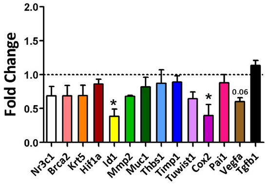 Gene expression of the evaluated markers in 16-week-old rats was analyzed using Student’s t-test for the Control group (regular rodent chow, n = 30 breasts) versus the Cafeteria diet (n = 30 breasts). * = p-value < 0.05. ID1 and Cox2 showed statistically significant fold changes, with p-values of 0.021 and 0.014, respectively. The p-value for VEGFA (vascular endothelial growth factor A) was 0.06.
