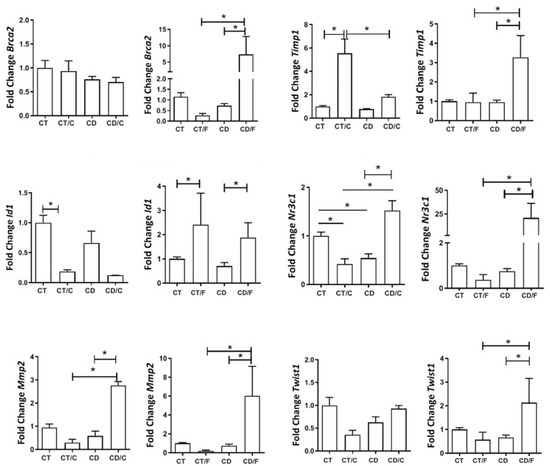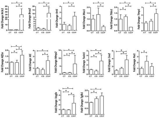 Gene expression of breast tumor markers in 25-week-old rats was compared among the following groups: a Control group of healthy rats (CT; n = 24 breasts), a group of rats fed a cafeteria diet (CD; n = 22 breasts), and a group of rats with fibroadenoma fed a cafeteria diet (CD/F; n = 2 breasts). Although the fibroadenoma group had only two samples, the standard deviation values derived from such a limited sample size are not statistically meaningful. Nevertheless, the values observed were markedly different from those of healthy breast tissue. * = p-value < 0.05.