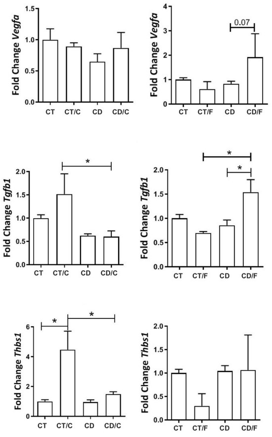 Between 72–89 weeks, we analyzed gene expression by functional categories (proliferation, inflammation, repair). VEGFα expression was comparable between groups but tended to be higher in fibroadenomas from the Diet group (p = 0.07). THBS1 was significantly higher in breast cancer samples from Control rats. TGF-β1 was elevated in all tumors compared to normal tissues, regardless of group (Figure 7).