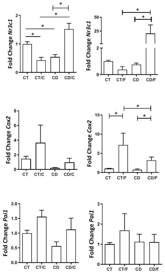 Gene expression of inflammatory markers in rats aged 72 to 89 weeks, comparing in the left column, a Control group with healthy rats (CT, n = 21 breasts), a diet Control group with rats that developed breast cancer (CT/C, n = 4 breasts), a group of healthy rats fed a cafeteria diet (CD, n = 27 breasts), and a group of rats with breast cancer fed a cafeteria diet (CD-C, n = 4 breasts). In the right column, a Control group with healthy rats (CT, n = 21 breasts), a diet Control group with rats that developed fibroadenoma (CT/F, n = 3 breasts), a group of healthy rats fed a cafeteria diet (CD, n = 27 breasts), and a group of rats with fibroadenoma fed a cafeteria diet (CD/F, n = 3 breasts). * = p-value < 0.05.