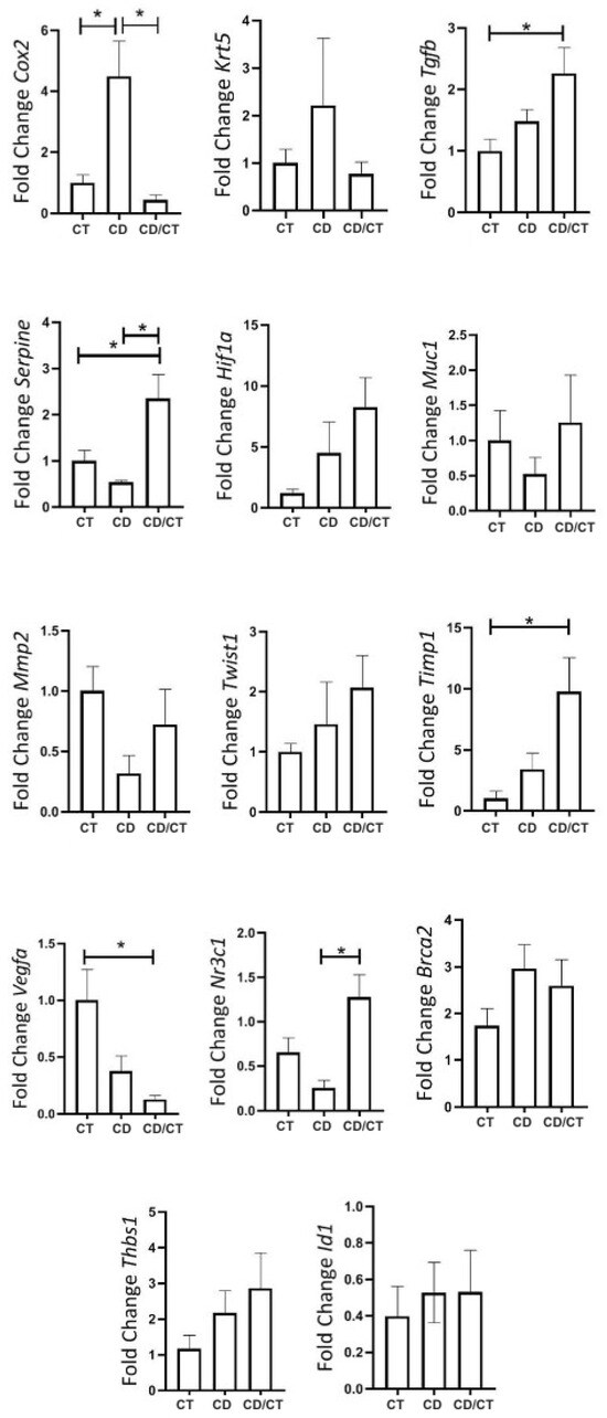 Gene expression of tumor markers in rats with reproductive senescence (102 weeks of age), comparison between samples of healthy mammary glands exposed to different diets. Regular rodent chow was used as the control (CT, n = 30 breasts), cafeteria diet (CD, n = 6 breasts) and rats that received a cafeteria diet from their fourth week of life until 98 weeks of age, with their diets replaced by regular rodent chow in the last 4 weeks of life (CD/CT, n = 14 breasts). * = p-value < 0.05.
