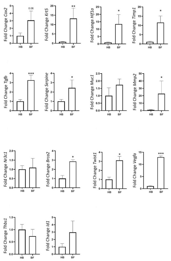 Gene expression of tumor markers in rats at the age of reproductive senescence (at 102 weeks of age) that had mammary fibroadenomas and received a cafeteria diet from their fourth week of life until 98 weeks of age, with their diets replaced by regular rodent chow in the last 4 weeks of life. Comparison between healthy mammary glands (HB, n = 14 breasts) and mammary glands with fibroadenomas (BF, n = 4 breasts). * = p-value < 0.05. ** = p-value < 0.01. *** = p-value < 0.001.