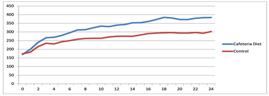 The mean body weight at 26 weeks of age was 263.09 g in the Control group and 426.76 g in the Cafeteria Diet group (p < 0.001). The mean Lee Index (LI) values were 298.12 in the Control group and 332.63 in the Cafeteria Diet group (p = 0.002). Mean fasting glucose was 76.06 mg/dL (p = 0.26), and mean perigonadal fat weight (PFW) was 8.21 g (p < 0.001).
