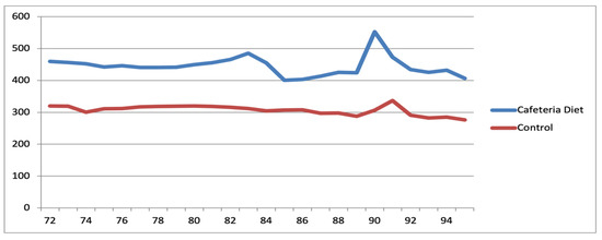 The rats were randomly divided into two groups: Control and Cafeteria Diet. The animals in the Control group received a standard diet consisting of regular chow for rodents (BioBase®, Águas Frias, Brazil), which contained 3.8 kcal/g (70% carbohydrate, 20% protein, and 10% fat), along with access to water ad libitum. The animals in the cafeteria group received a cafeteria diet, adapted from Goularte et al. (2012) [49], consisting of standard chow for rodents (BioBase®, Brazil), Italian salami (Sadia®, Concórdia, Brazil), bread (Nutrella®, Sao Paulo, Brazil), cheese snack balls (Cheetos, Pepsico®, Sao Paulo, Brazil), marshmallows (Fini®, Jundiaí, Brazil), mixed sausages (Sadia®, Brazil), chocolate cake (Renata, Selmi®, Sumaré, Brazil), cornflour biscuits (Zadimel®, Marechal Cândido Rondon, Brazil), mortadella (Frimesa®, Medianeira, Brazil), bacon-flavored snacks (Troféu, Santa Helena®, Ribeirão Preto, Brazil), chocolate wafers (Bauducco®, Guarulhos, Brazil), and 350 mL of degassed Cola-Cola (Coca-Cola®, Rio de Janeiro, Brazil) or Guaraná (Antarctica, AmBev®, Sao Paulo, Brazil), alternated weekly.