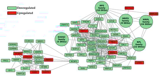Network constructed using all the input DEGs. Downregulated DEGs are shown in green and upregulated ones in red. The large dots represent DEG families grouped together to improve clarity. All DEGs within the same family share the same fold change trend, which is reflected by the color of the dot.