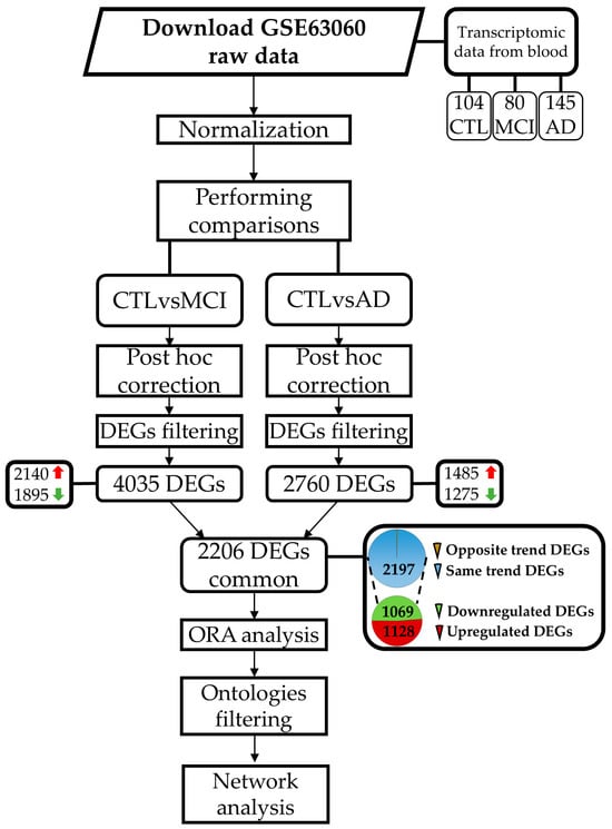 Benjamini–Hochberg post hoc correction was used to adjust the p-value and reduce the number of false positive DEGs in our analysis. All the genes with a q-value < 0.05 were considered as statistically significant DEGs. The DEGs in both comparisons (CTLvsMCI and CTLvsAD) were used for ORA, performed using the package “clusterProfiler” v.4.6.2 []. This analysis confirmed that GO that showed statistically significant changes in both comparisons. A network analysis was also implemented to obtain an additional filter and to highlight the connections among the altered DEGs. To obtain all the connections among the DEGs resulting from the analysis, we used STRING v.12.0 [], consulted on 1 June 2025. The information obtained from the STRING database was studied through the software “cytoscape” v.3.10.3 []. Figure 5 summarizes the workflow used for the analysis.