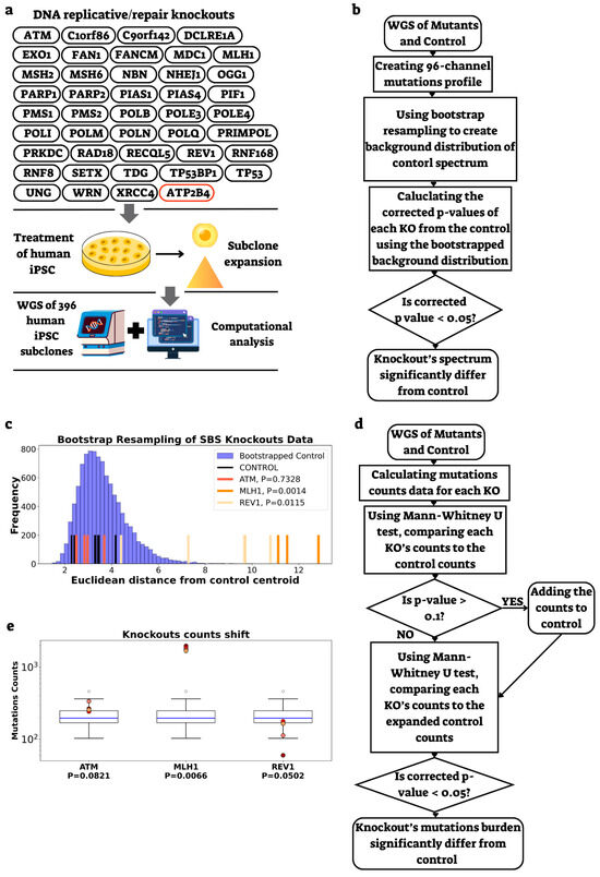 Methodology. (a) Schematic representation of the KO dataset, highlighting the control gene (ATP2B4, in red), and the experimental workflow from subclone generation to computational analysis. (b) Diagram outlining the process from WGS of KO and control samples, through mutational profile generation, to the identification of significant differences in mutational spectra using bootstrap resampling. (c) Histogram of Euclidean distances for bootstrapped control replicates (blue), original control samples (black), and three example KOs (ATM, MLH1, and REV1; red shades). Corrected p-values (see Section 4) indicate significance of spectrum changes. ATM KO shows a non-significant change, while MLH1 and REV1 KOs are significant. (d) Schematic illustrating the process from WGS data to detection of significant differences in total mutation counts between KOs and controls, including the use of an expanded control group. (e) Boxplots depicting mutation count distributions for the expanded control group, with individual KO replicates shown as colored dots. Corrected p-values (two-sided Mann-Whitney test) compare each KO to the expanded control. For detailed results, including INDEL analysis (see Supplementary Table S1).