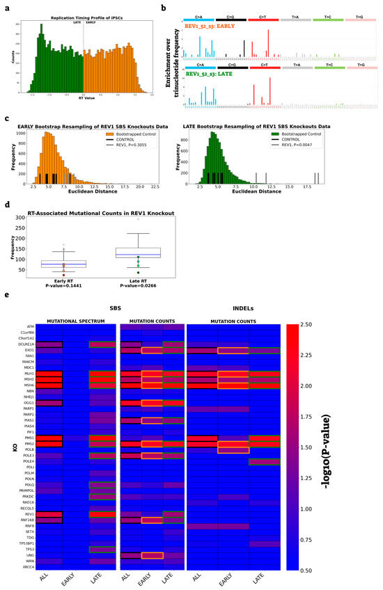 Replication timing-dependent mutational effects in iPSC knockouts. (a) Histogram showing the distribution of RT values in hiPSCs. The dashed grey line separates early- (orange) and late- (green) replicating regions. (b) Normalized 96-channel SBS profiles for the REV1 knockout, shown separately for early- (top) and late- (bottom) replication timing regions. (c) Euclidean distances of bootstrapped control replicates (histograms), original controls (black lines), and REV1 knockout replicates (gray lines), shown for early- (ERR, orange histogram, left) and late- (LRR, green histogram, right) replicating regions. The geometric mean of corrected p-values is indicated. (d) Boxplots display the distribution of mutation counts for the expanded control group in early and late RT regions. As expected, mutation burden is higher in LRR for the control samples. Mutation counts for REV1 knockout replicates are overlaid as colored dots (orange for ERR, green for LRR), with corrected p-values from two-sided Mann–Whitney tests shown. Notably, REV1 knockout reduces mutation burden specifically in LRR. (e) Heatmaps of −log10 (corrected p-values) for SBS mutational spectrum and mutation counts across all, early, and late RT regions (left) and for INDEL counts (right). Significant results are highlighted by colored edges (black: all RT; orange: ERR; green: LRR). Color intensity reflects the −log10 (corrected p-value). For detailed results, see Supplementary Table S1.