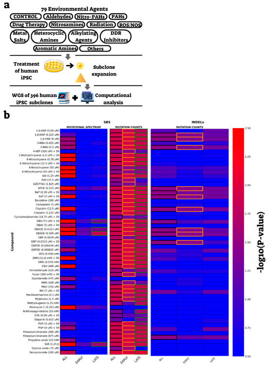 RT-dependent effects of environmental mutagens in human iPSCs. (a) Schematic representation of the experimental design for mutagenic compound analysis, including the major classes of environmental agents tested. The full list of compounds is provided in Supplementary Table S2. (b) Heatmaps displaying −log10 (corrected p-values) for SBS mutational spectrum and mutation counts across all, early, and late replication timing regions (left) and for INDEL mutation counts (right). Colored edges indicate statistical significance (black: all RT regions; orange: early-replicating regions [ERR]; green: late-replicating regions [LRR]). Color intensity reflects the −log10 (corrected p-value). For comprehensive results, see Supplementary Table S2.